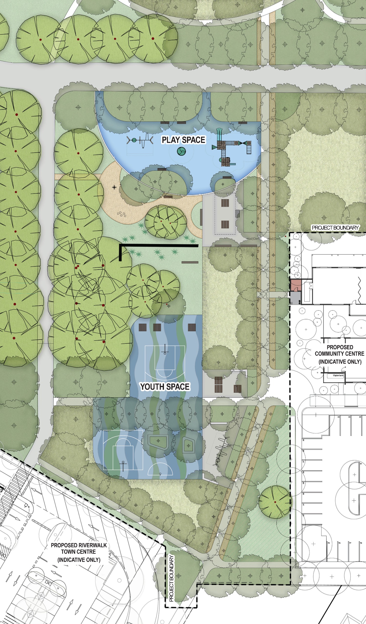 Plans include a play space, picnic area, youth space, fenced dog off-leash park, kickabout lawn, walking paths, tree-lined avenues and new planting, as shown in the Riverwalk Community Precinct Plan.